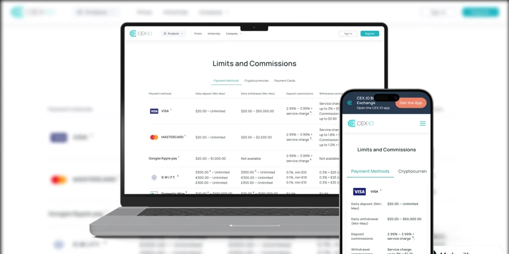 Visit CEX.IO’s Limits and Commissions page to get a detailed overview of the accepted payment methods as well as their deposit/ withdrawal limits and commissions. Also, note that you can deposit and withdraw crypto from your CEX.IO account.